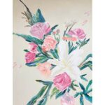 草花をモチーフにしたものや「ズレ」た風景、日常生活から着想を得た作品のほか自身の作品をプリントした大判の布といった横断的なメディアで制作を行う。