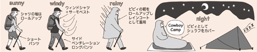 近年、登山愛好家の間で、荷物をできるだけ軽く、シンプルにして登山や山歩きを行う"ウルトラライトハイキング"と呼ばれる新しい楽しみ方が増えてきています。"ウルトラライトハイキング"は長距離を一息で踏破するため、荷物を軽量化して体力を温存することと、天候変化に対する安全性の確保が重要なポイントとなっています。そこで『マーモット』が提案するのが、徹底した軽量化と防水性や保温性等の機能性の両立を追求した"ライトパッキング"コンセプトのシリーズです。中でも特徴的なアイテムが、ビビィ(寝袋カバー)にも変形する一人二役のポンチョ「ゼロソリタリービビィ」です。ポンチョのウエスト部分に丸めて収納されているカバー部分を広げることで、寝袋カバーとして簡単に野営に移ることができ、また、着用したままカバーを収納してポンチョに戻すこともできます。さらに平均重量は240gと軽量ながらも、レインウエアとしては、耐水圧20,000mm、透湿性20,000g/?/24h(B-1)という高い機能性も併せ持ちます。