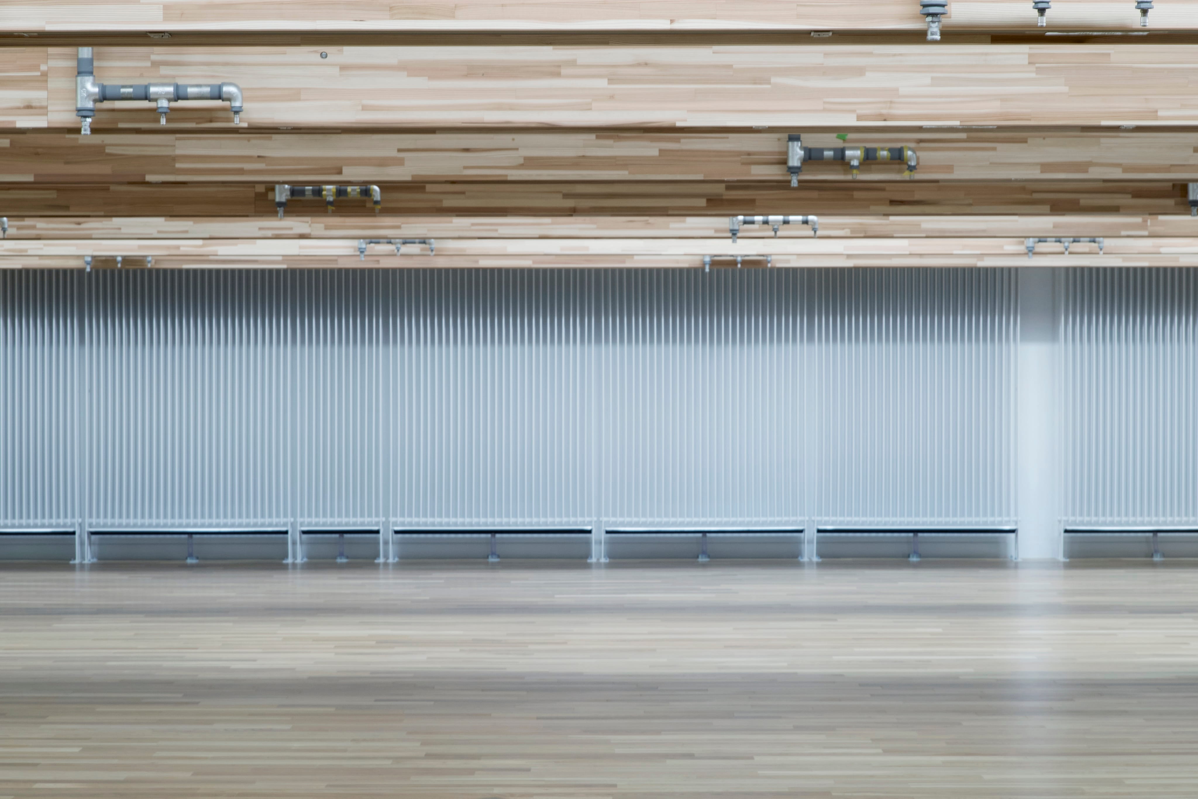 裁断・縫製エリアの壁全面に配置した、ふく射熱冷暖房設備