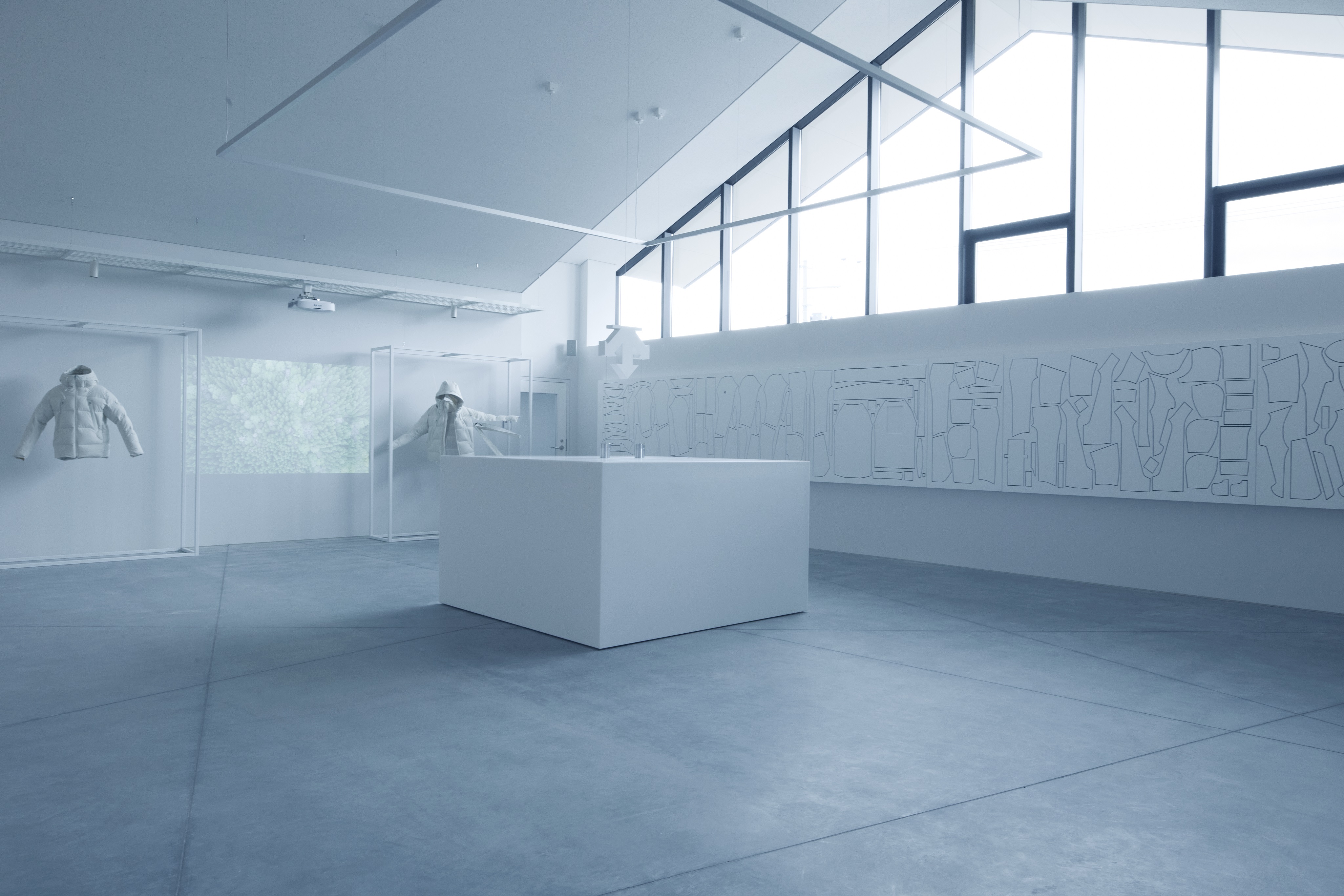 新工場のエントランスホールには水沢ダウン1着の全裁断パーツを配置した約10メートルのパターンボードを展示している