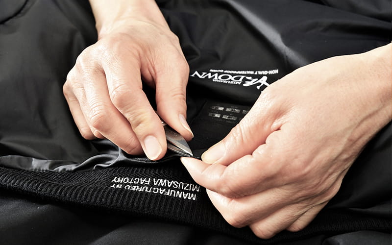 ダウンウェアが抱える弱点を克服するために、元々スキーウェアなどに使用されていた熱圧着加工(熱によって生地と生地を貼り合わせる加工)とシームテープ加工(縫い目から水が入らないよう縫い目に特殊なテープを貼る加工)を採用しました。ただその開発過程は苦難の連続。特に熱圧着加工を使ってダウンパックを作成できるようになるまでには、気の遠くなるような手間と時間がかかりました。それでも「最高の製品を作りたい」という思いを原動力に、水沢工場の職人と開発チームで試行錯誤を繰り返し、開発に成功したのです。