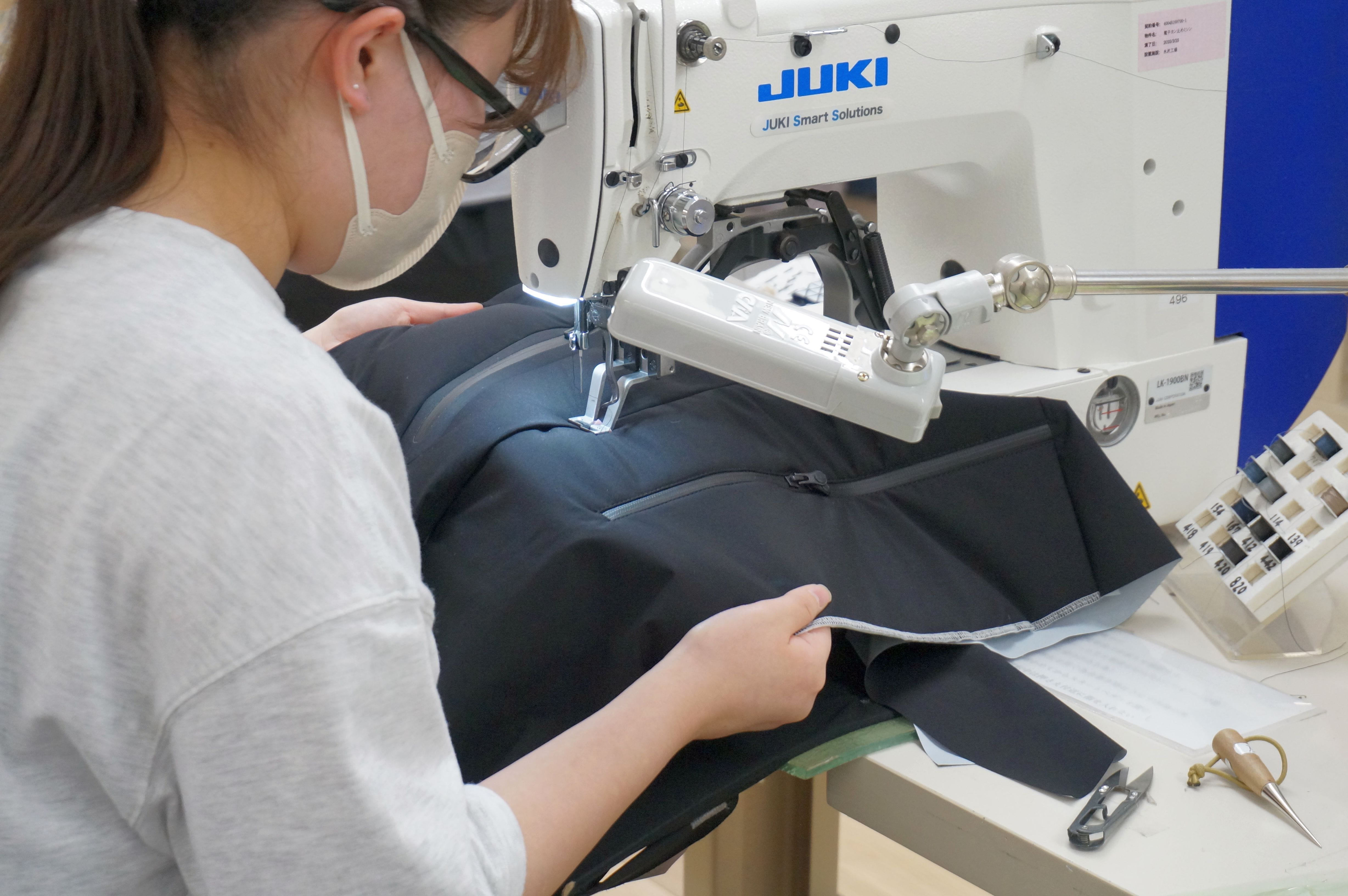 ミニマルな見た目に反して水沢ダウンの作りは複雑で、生産工程の多くは熟練した職人の手作業によって成されています。ウインドブレーカーなど通常のアウターウェアの4倍にあたる280もの工程が製作には必要となります。曲線ばかりの膨大なパーツを縫い合わせることは、それだけでも簡単ではありませんが、水沢ダウンの生地は伸縮性が高く、また多彩な機能が付加された特殊な素材を使うことが多いため、職人は生地ごとに癖を見抜き、最善の方法を見つけ出しながら服へと仕立てていきます。