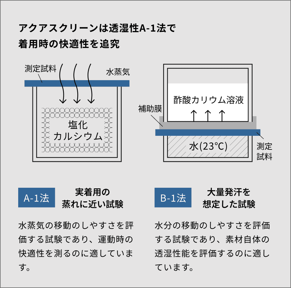 ウェア内の湿気を逃がすことでムレを軽減します。一般的な透湿性試験B-1法に加え、実際の着用環境に近いA-1法での試験もクリア。実用性に優れた透湿機能により、蒸れにくい快適な着心地を提供します。