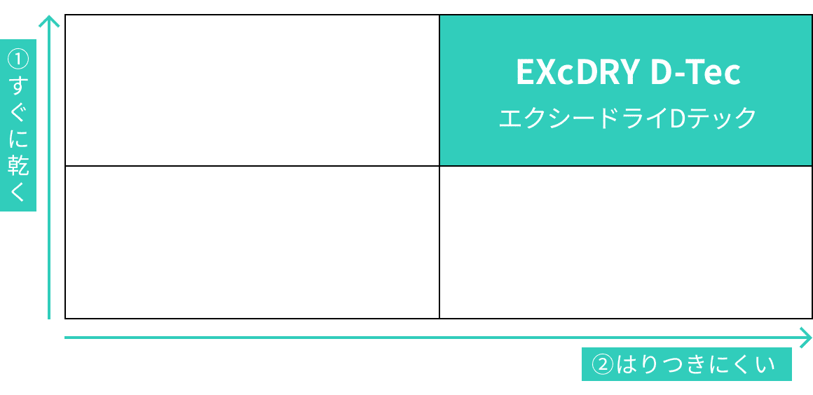 「エクシードライDテック」は、すぐに乾くドライ機能、濡れてもはりつきにくいドライ機能という2つのドライ機能で快適性を両立。大量の汗をかくことが多い夏のスポーツに最適な機能です。