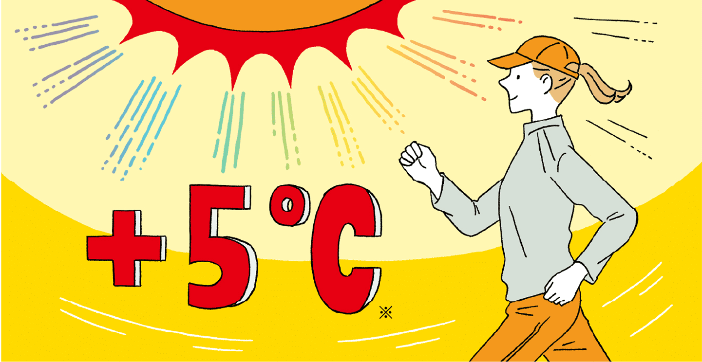 波長とは、紫外線、可視光、赤外線のことをいい、ヒートナビが開発される以前は、赤外線のみ反応する素材が多かったのですが、特殊な蓄熱材を開発したことで光の全波長を熱に変えることを実現しました。その効果は、+5℃※。